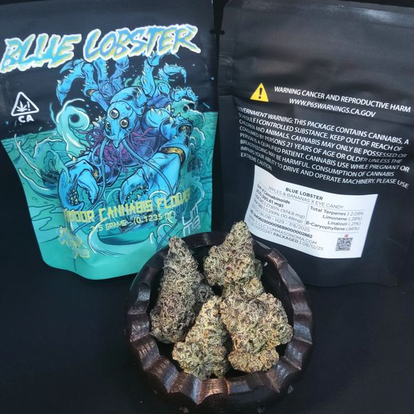The Lobster has landed!! Well, we've done it folks. We have come across something truly special here. The award-winning and much lauded strain Blue Lobster is here presented by Umma Sonoma, grown to perfection and ready to be thoroughly enjoyed. The first thing you notice when opening this up is just how bonkers the buds look. Purple, green, and trichome coated like nothing I've seen recently. Lush bouquets of terpenes provide a delicate yet pungent scent that simply defies description. Think "Apple Fritter" meets a decadent velvet cake. Nicely balanced high that is relaxing and stony, but not too heavy rounds out the whole package. A bona fide winner.